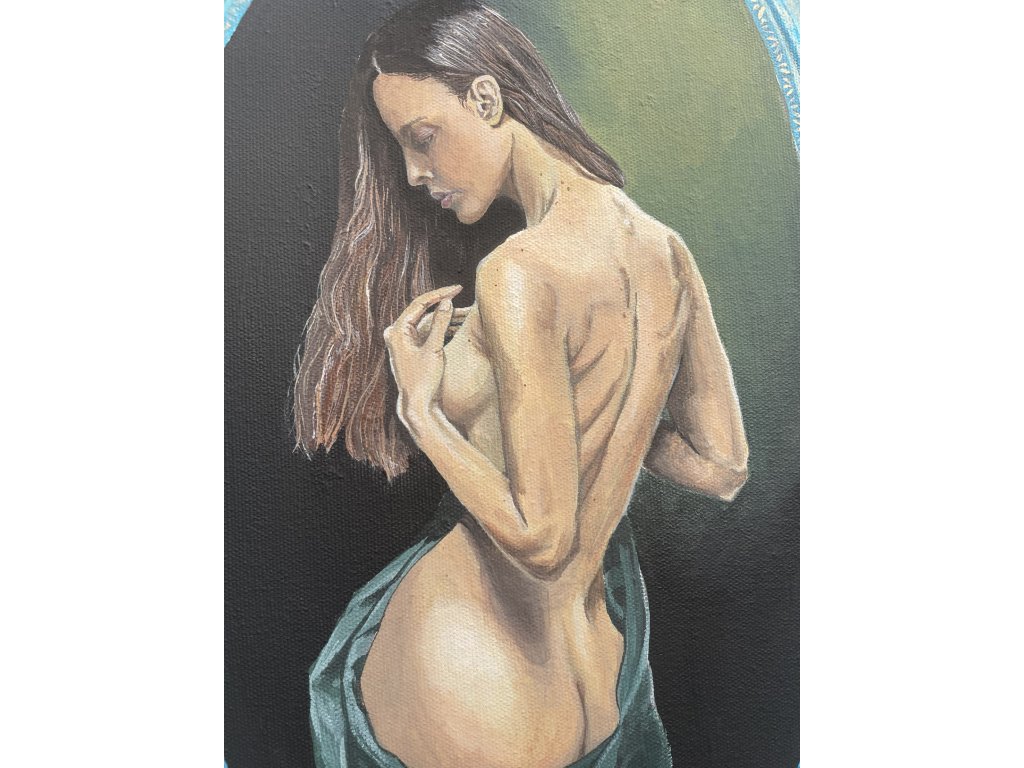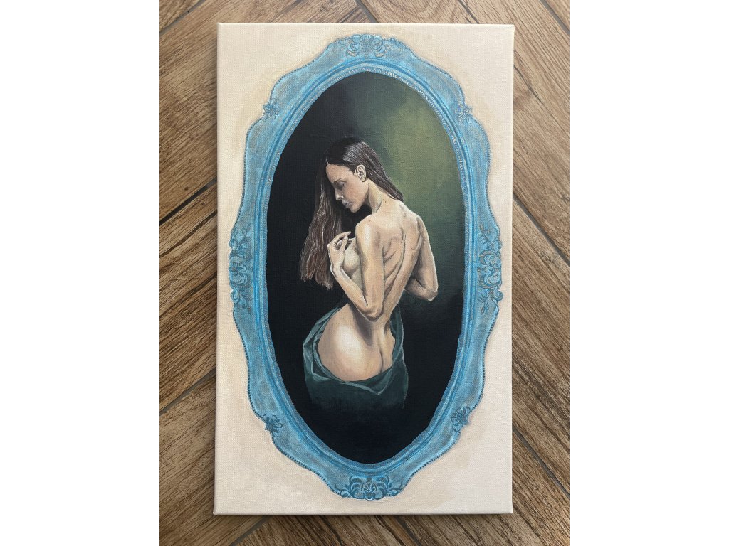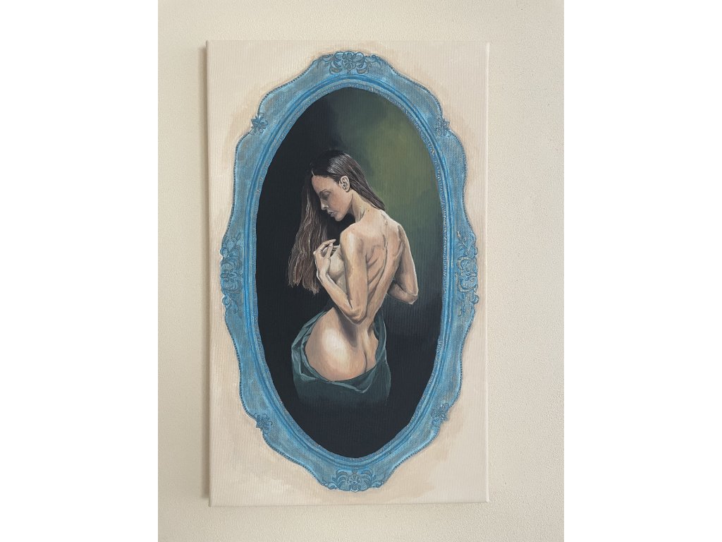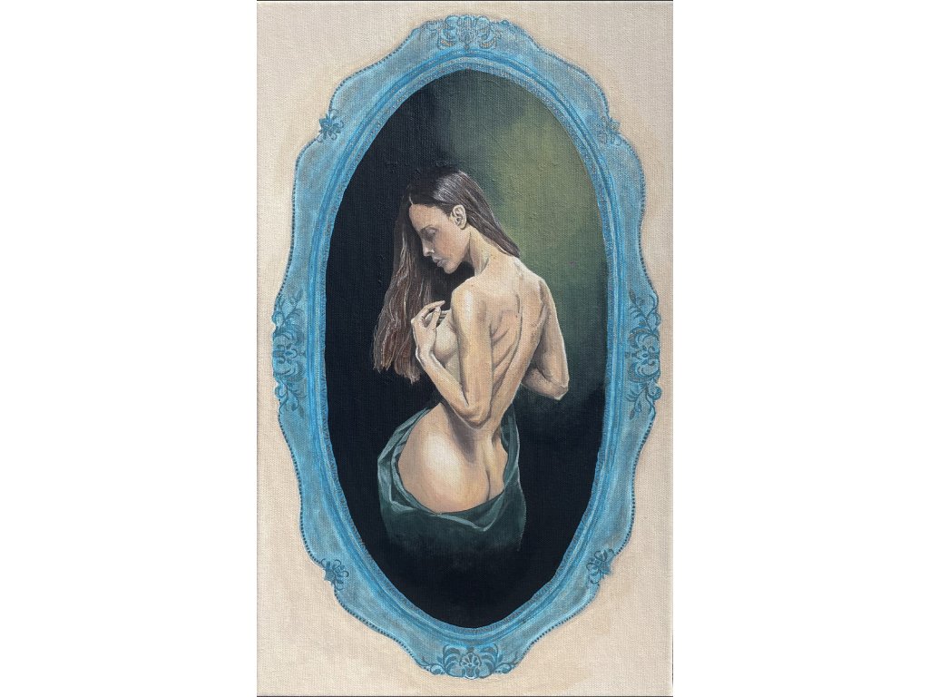 Umístěna v barokně působícím rámci se stává téměř relikvií, ozvěnou sentimentálních portrétů ze zapomenuté galerie. Je oslavou ženské krásy a přirozenosti, vhodný pro milovníky ženských proporcí s nádechem tajemna.