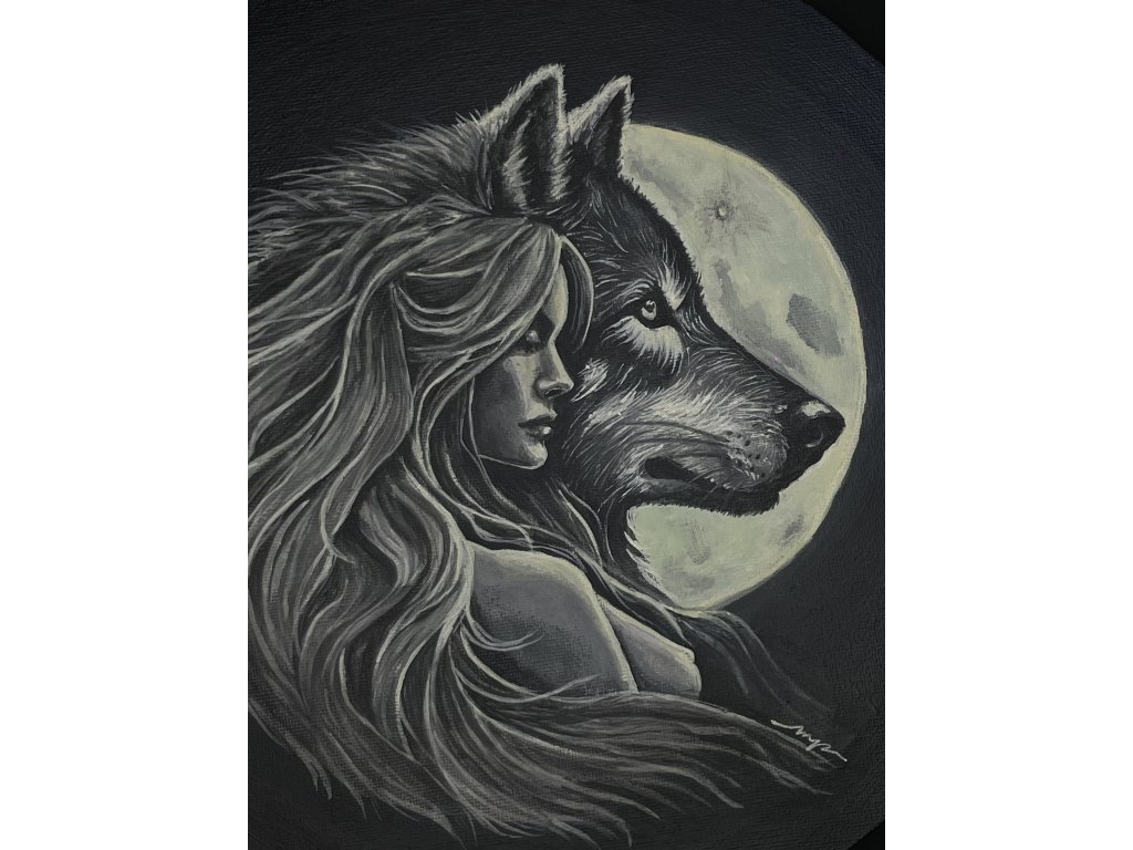 Žena pevně spjata s vlkem, jako jedno tělo - jedna duše, a zářící první zimní úplněk Vás pohltí do hlubin tichého rozjímání. Kde stále můžeš cítit lehkou divokost.